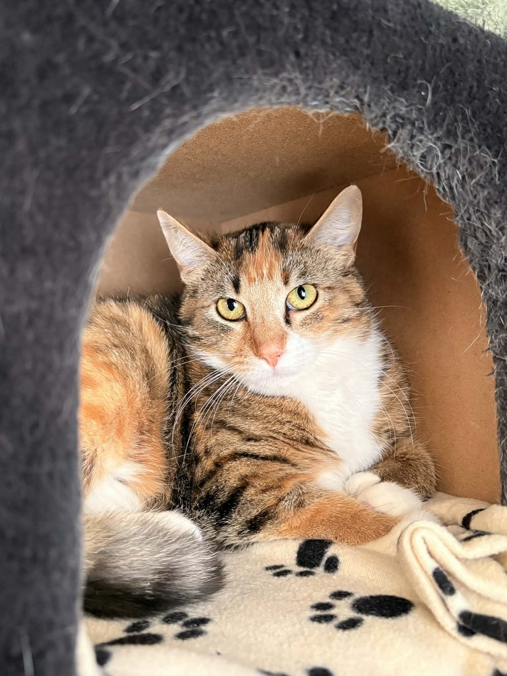 I arrived here with a group of feline friends, and we've had limited socialization with people. I often feel safest watching from a cozy hiding spot, taking in the sounds and movements of the people around me, but have been slowly gaining confidence when the shelter is quiet and around people that I know and trust!
