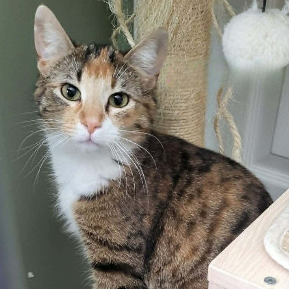 Hi, I'm Dora, a gorgeous torbie gal with a soft, dreamy coat and a quiet presence. I'm quite a reserved type of girl, and I'm still taking my time to understand this new world around me. I'm a little extra special due to my genetic mutation, I'm polydactyl and have extra toes on each of my four paws!