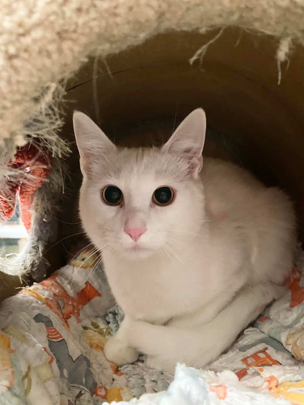 Hello, I'm Duchess! I came here from a rescue in Lethbridge with my three kittens Berlioz, Hector, and Maurice. I'd love to find a home either by myself, or with one of my kittens if you're looking to add two cuties to your home! I am a sweet and gentle girl, with beautiful silky white fur. While I can be timid at first, as soon as you pet me I am full of purrs and will arch my back requesting more pats. Can't wait to find a loving forever home!