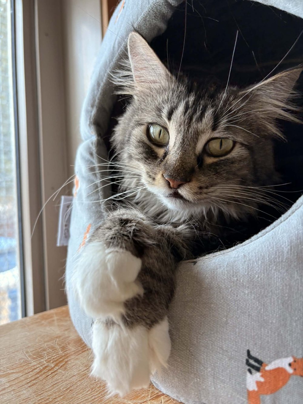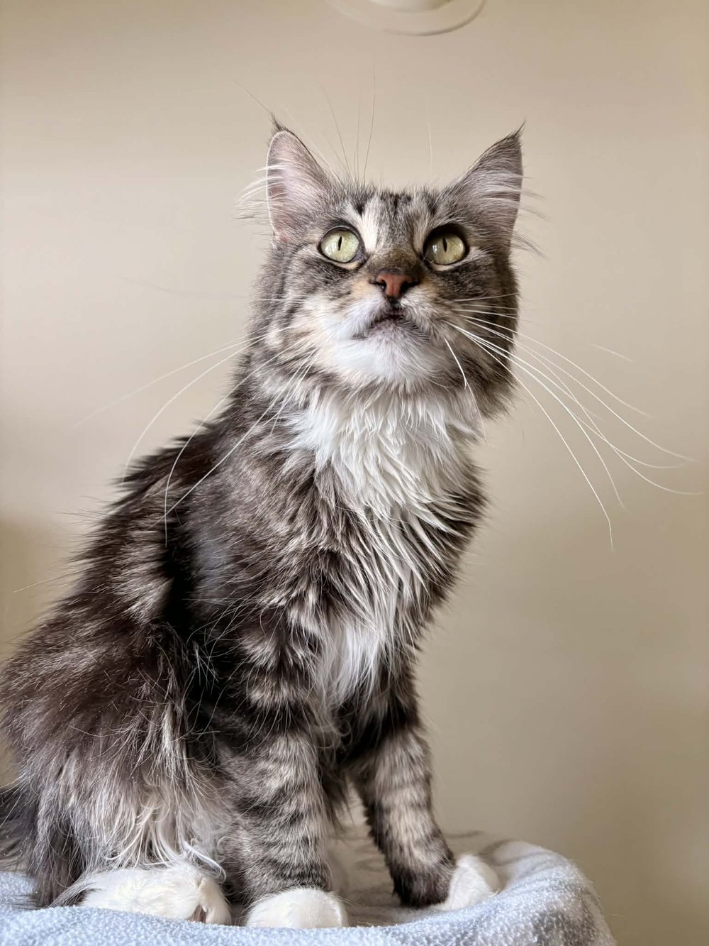 Hi, I'm Ducky! I got my name because I have a cleft palate that makes me uniquely me, and honestly, I wear it with pride! I'm a striking longhaired beauty with a tender heart and a soft spot for cozy naps. My love language? Chicken dinners, gentle head scratches, and settling into a warm nook where I can purr my thanks. I may be a bit medically quirky (the staff can tell you more about my medical history), but that just means I've got extra character AND extra appreciation for anyone willing to share their home and maybe a bit of chicken. I'm approaching my senior years, but I'm hoping to spend my retirement enjoying the finer things in life like sipping water straight from the tap, basking in sunbeams, and curling up for a cat nap. If you're looking for a sweet, soulful companion with snuggles to spare, this Ducky is ready to waddle right into your heart.
