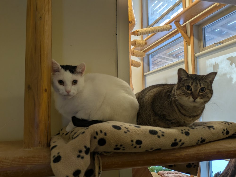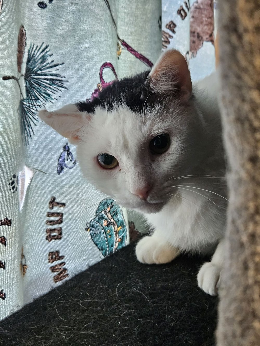 Hey, we're Marshmallow and Candy, a quirky yet sweet bonded pair of cats looking for a loving home where we can stay together. We're both very skittish and scared, so we lean on one another for support. I'm the more nervous of the pair, and I'm not yet ready to be touched or cuddled, but if you take the time to get to know me slowly and on my terms, with my trusted people I will warm up to affection. I'm a funny little guy, with a silly 'haircut' that almost looks like bangs. Despite my prickly exterior, I really am a big marshmallow inside, and can't wait to show my gooey lovey side! We'll need a home that comes with lots of patience, but in the right environment, our true purrsonalities will be able to shine through!