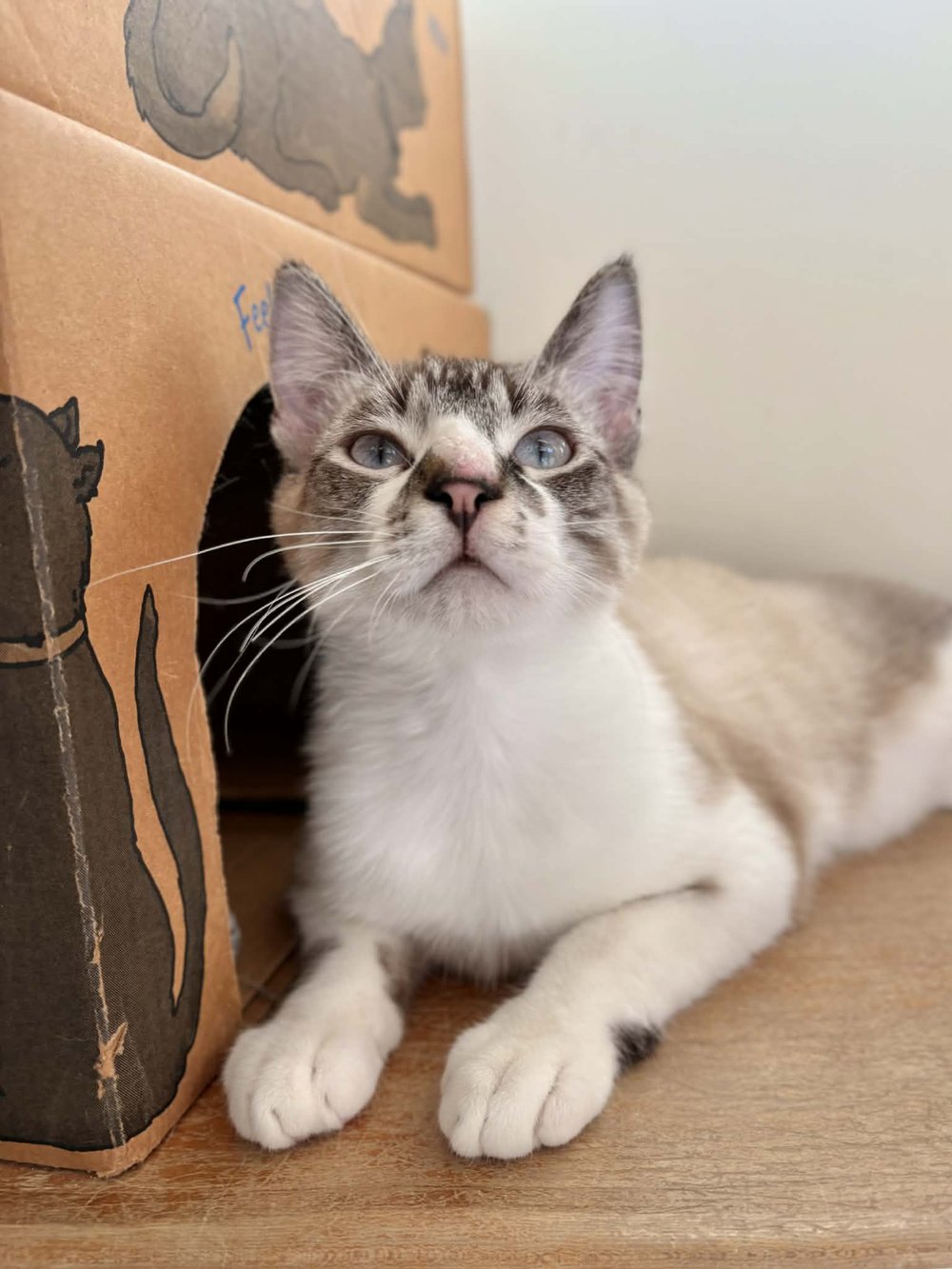 Hi, I'm Simon! I'm a roly-poly, squirmy-wormy kind of guy who absolutely thrives on attention. If something's happening, I want to be right in the middle of it. My purr motor is almost always running, and it kicks into overdrive the moment someone scratches my chin or pets my back, which is honestly hard to resist because my creamy fur is so silky-soft. I bring the fun (and, okay, maybe a little bit of chaos) wherever I go. Life with me is lively, sweet, and full of personality. I'm hoping to find a family who can keep up with my energy and shower me with endless love and snuggles!