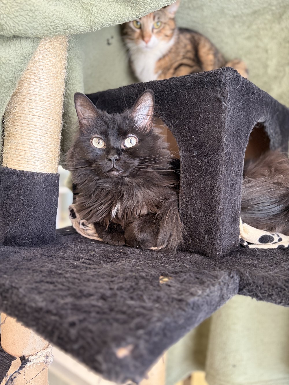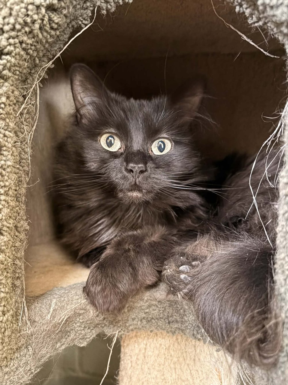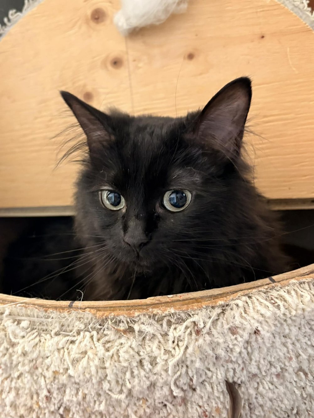 Hello, my name is Stevie. I'm a beautiful longhaired black girl with a soft heart and an even softer purr. I may be a little quiet when we first meet, as new places and faces can feel a bit scary, but once I know I'm safe, I blossom into the sweetest snuggle buddy you could imagine. I came to the BVSPCA with some tangles in my luxurious coat, and the kind humans here have been patiently and carefully working out my mattes so my stunning fluffy fur can shine. I'm going to need regular grooming in my forever home to keep my gorgeous coat and fluffy tail looking their best. I love gentle affection, cozy naps, and sharing my beautiful, soothing purr with someone special. I'm a gentle soul who will do best in a calm, loving home where I can take my time and show you just how sweet I truly am.