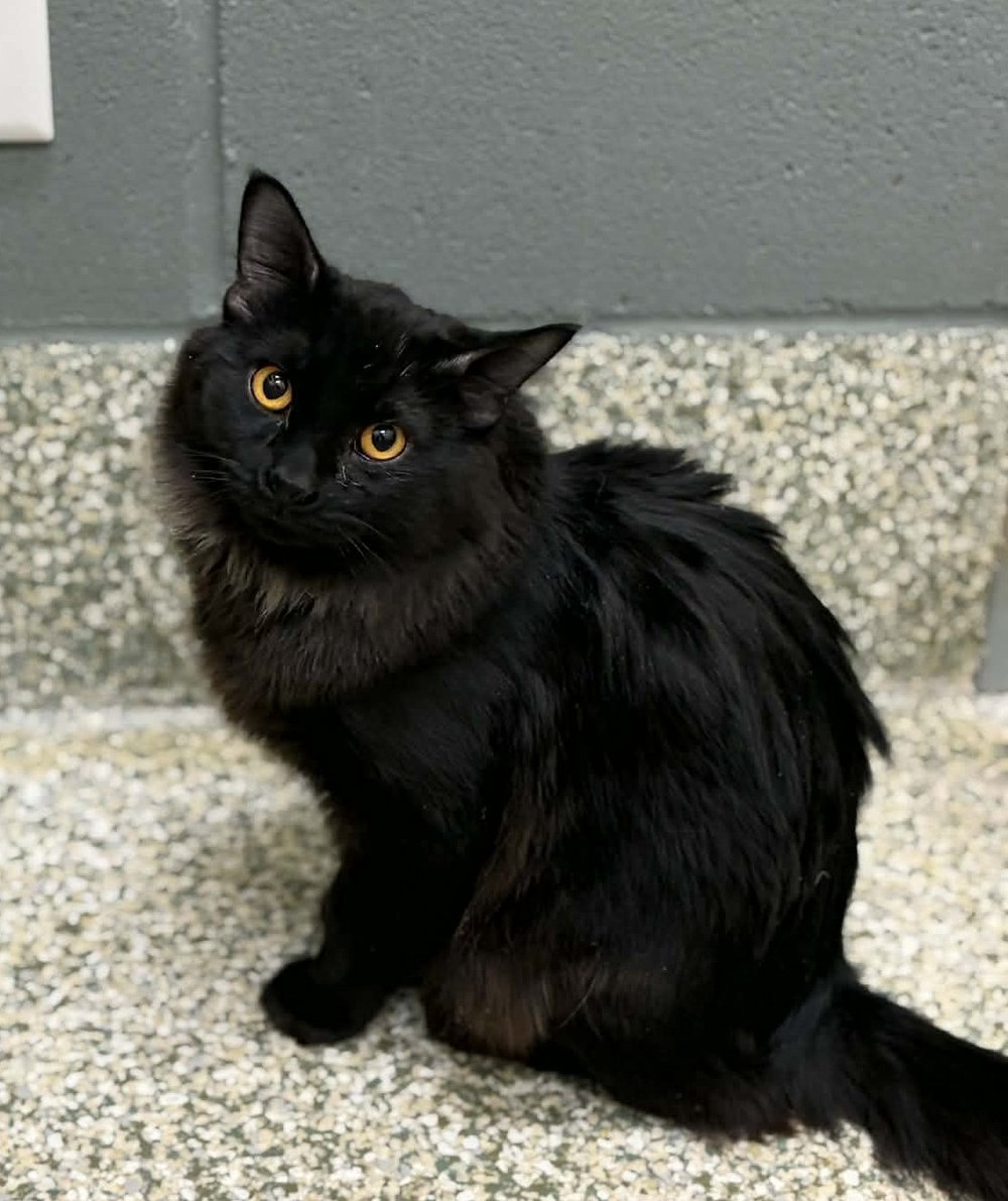 Hey, my name is Wednesday, and I'm a bit more timid than my boisterous Addams Family friends. I'm a bit slower to leave my cozy hidey-hole, but when I do, you'll surely be blown away by my ridiculously soft and shiny raven-black fur and my striking orange eyes are! I'm a lovely little guy who will undoubtedly blossom into a confident, sweet kitty with a calm, patient approach. Despite my uncertainty, I know I LOVE a chin scritch and to cuddle my head into your hand.