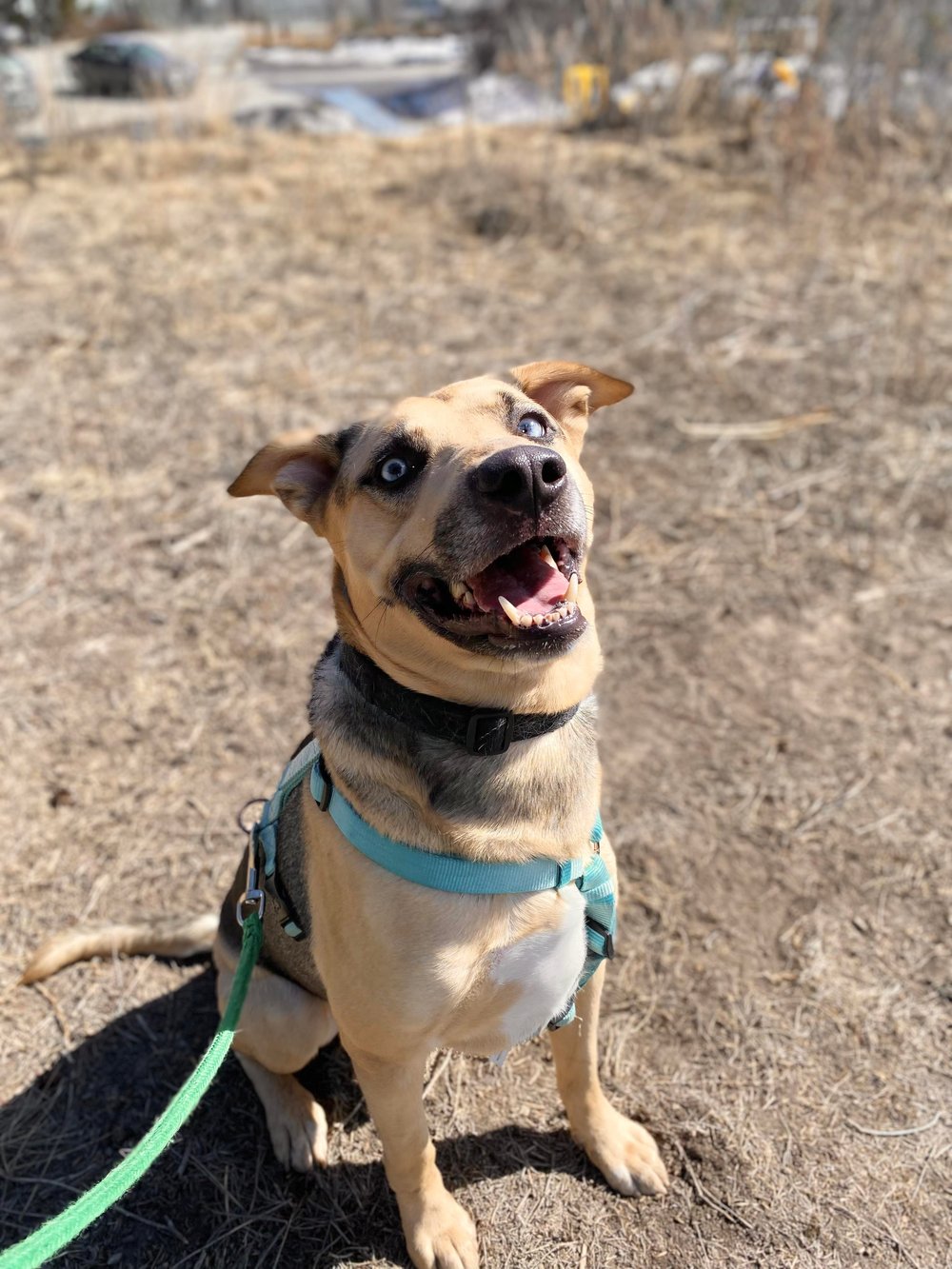 Hey! I'm Buckwheat (Buck for short), and I'm so excited to meet you! I'm a happy-go-lucky, curious and friendly Husky/Pitbull mix. I came to the SPCA through no fault of my own, and I'm looking for a loving home where I can be a treasured part of the family. I have the most striking blue eyes, but I'm not a serious guy - in fact I'm a real goofball who makes some pretty silly faces! I'm full of wiggles and love, and while I'm down for a snuggle if you are, I can also be independent doing my own thing which can be nice if you want some time to yourself. I walk great on leash, and there is nothing (and I mean NOTHING) that I love more in the world that a chew toy to gnaw on! I am what they'd call a super-chewer, so no stuffed toys for me. I thought they were made for shredding, but apparently not? The good news is I'm crate trained, and so I am happy in a crate when you leave the house. When you're home, I'd love some super chewer toys and puzzle toys to keep me from getting bored and creating my own fun. I got to try out some agility here at the shelter, and I am a natural, so it might be fun to continue this, or another dog sport, in my new home! I can have a sensitive stomach, but after some trial and error, we've found a diet that is working well. It will make both our lives much easier if I stay on this diet long-term to avoid future flare ups. I am choosy about my canine friends, so while I've made a couple dog friends here at the shelter that I like to wrestle and bounce around with, off-leash dog parks won't be for me, at least for now. I would do well as the only animal in the home, but I might like to have a doggie companion, I'll just need to meet them first to see if we'll be buds. Cats seem like they might be fun to chase, so I'll do best with a home without. If you're looking for an all-around great dog who's smart, snuggly, and brave and adventurous, look no further!
