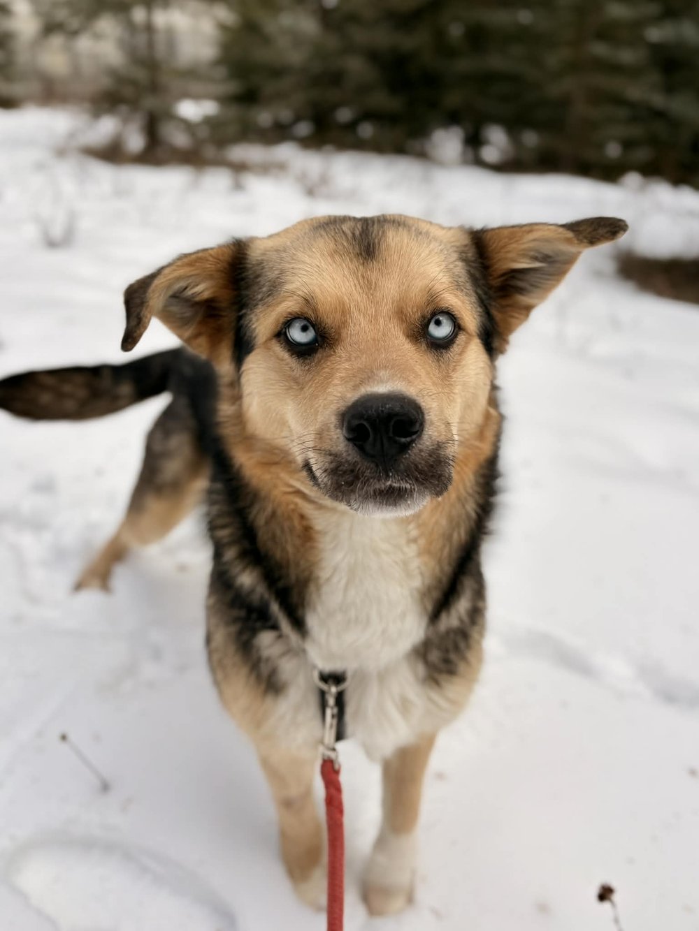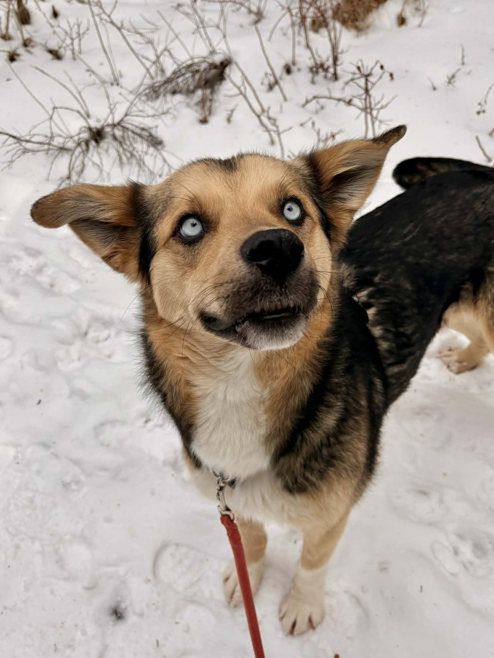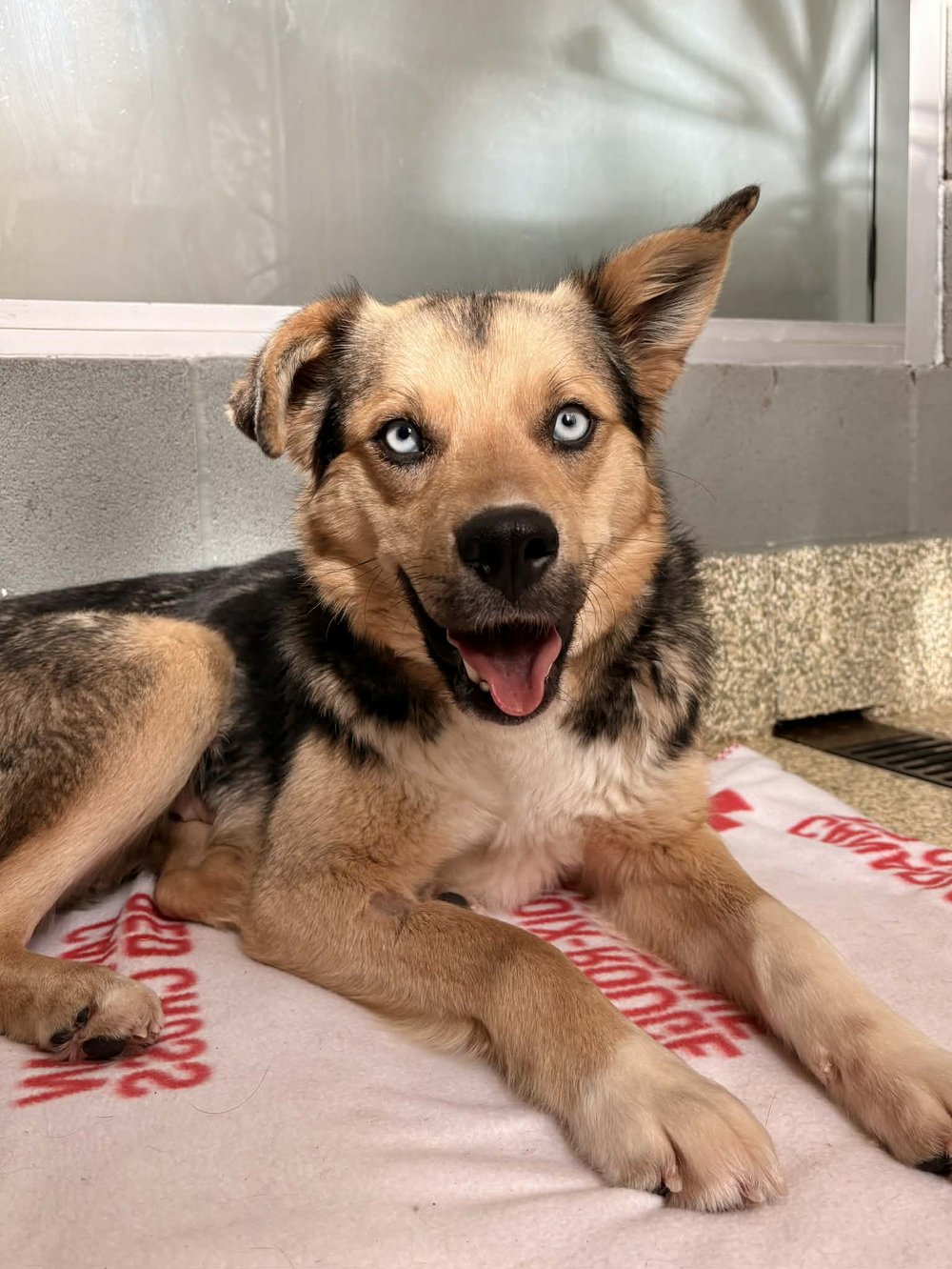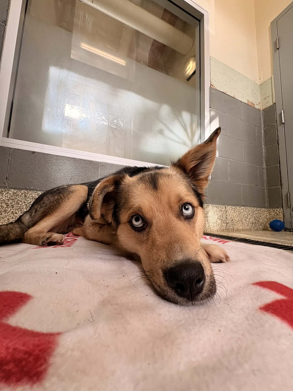 Hi there, I'm Kanga! I'm a shy but curious girl with steel-blue eyes and the most expressive, gigantic ears you've ever seen. I spent my early days being the best mom to my puppies, Roo and Joey, but now it's finally my turn to learn how to be a puppy myself. The world still feels big and a little overwhelming, yet I'm learning to explore it with gentle bravery, one step at a time. When I meet new people, my whole body can't help but wiggle with excitement and my signature full-body tail wag, and I love nothing more than curling up close for warm, quiet cuddles. I'm a tender soul who just wants a patient, loving home where I can blossom, feel safe, and discover all the joy waiting for me.