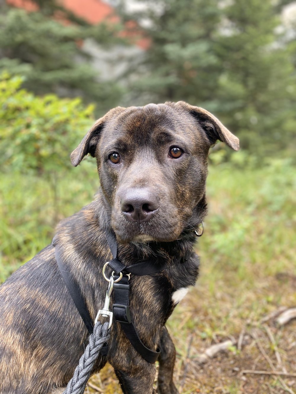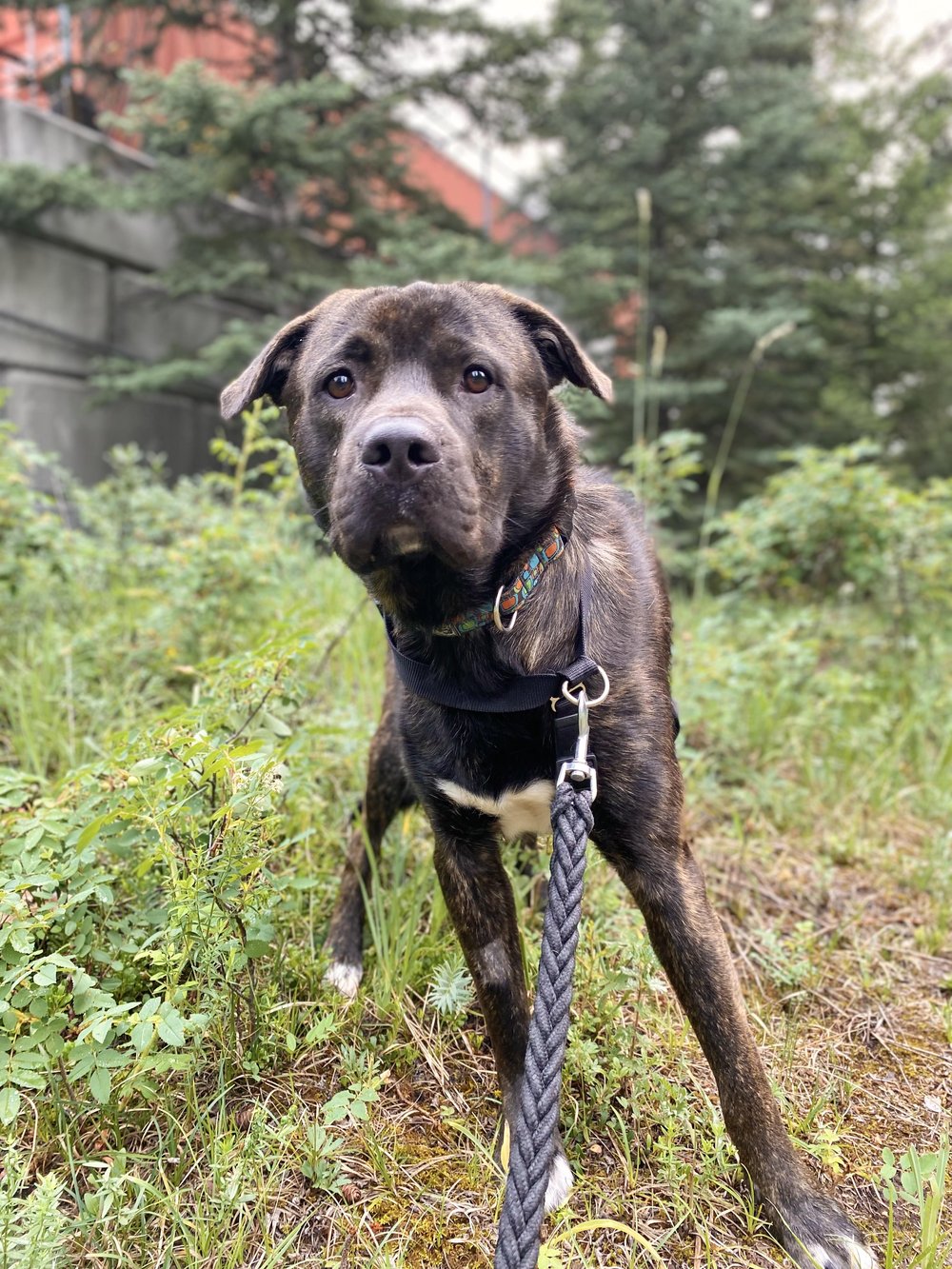 Hey there, I'm Manny! I arrived to the BVSPCA after being found stray, and sadly nobody came to claim me. I can be timid (who can blame me, it's a confusing period of my life), but I have a kind, gentle soul, and just need to build some confidence once I realize I am safe. I am a very sweet boy, and still young and very trainable. I think I'd like a quieter home for now where I can settle in, and then my true colours will shine! I am a very loving boy, and even though I am scared, I will lean right into the people I trust for a head scratch. While loud, exuberant dogs can overwhelm me, I would really love to go to a home with a calm, confident resident canine, as I reference my canine foster-sister to judge whether a situation is safe or not. Having a stable, well-adjusted dog to help me feel safe will make an adjustment to a new home much easier. I'd prefer a home without young kids for now, because I startle very easily with any loud noises or sudden movements. Speaking of, I am a flight risk right now, and will try to bolt on walks if I hear a big scary noise or see something that scares me. I'm also quite crafty at slipping out of a harness, so my new owners will need to be prepared to work to earn my trust before working up leashed walks in busy public settings. A secure backyard with a tall, escape-proof fence would be great for the first bit while I settle in. Off-leash settings won't be safe for me right away, and my new adopters should be aware that I may always be a flight risk. I will definitely need to bond with my new people, take lots of time to decompress, and learn that I am safe before trying an off-leash setting. Unfortunately, I am not well suited to apartment living. In an environment I feel safe, I am affectionate and my full-body wiggles will tell you I'm feeling safe! I can't wait to be in a stable and loving home that can help me to become the best version of myself!