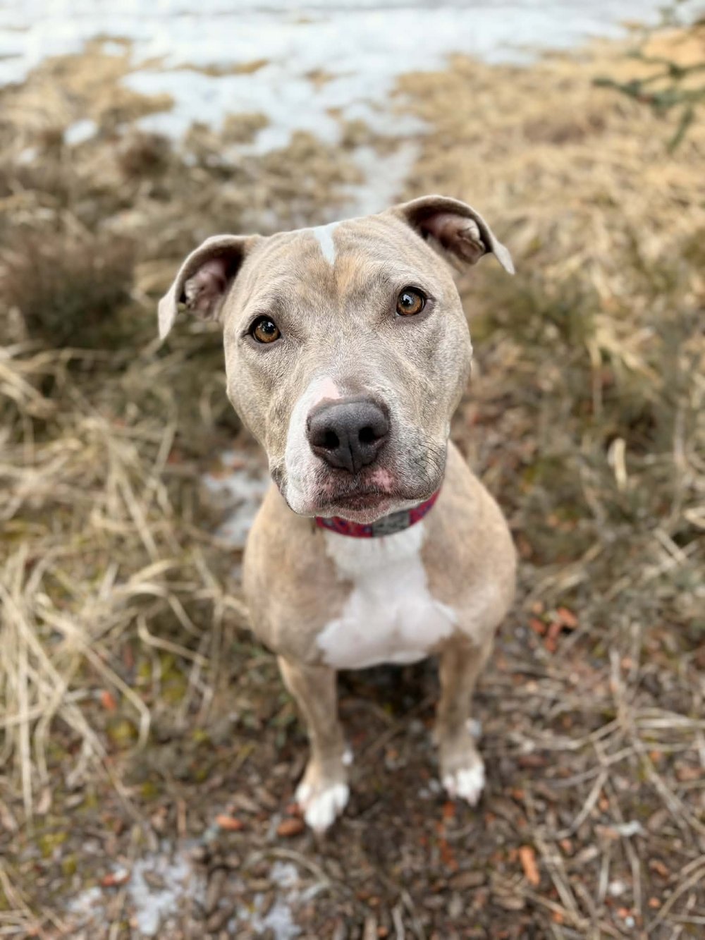 Millie here, your soon-to-be best friend, in-house comedian, and resident wiggle-butt extraordinaire! I'm an exuberant and loving pitbull mix wrapped in a gorgeous dilute brindle coat that strangers constantly compliment (I pretend to be modest, but honestly, I know I look fabulous). I'm bouncy, joyful, and powered by what experts call "zoomie energy," and I absolutely adore people. I especially love kiddos (I've grown up with infants/toddlers) because they're fun, they drop snacks, and they think my goofy antics are hilarious. I'm wonderfully well-behaved in the house, a champion cuddler, and a pro at making humans feel loved. I'll admit that my leash manners are still a work in progress, but I'm trying really hard and learning quickly how to be the goodest girl I can be. The world is just so exciting that sometimes my legs take off before my brain catches up! I dream of a home filled with laughter, adventure, and cozy soft spots for snuggling, and I promise to bring joy, silliness, and unconditional love to anyone lucky enough to call me theirs.