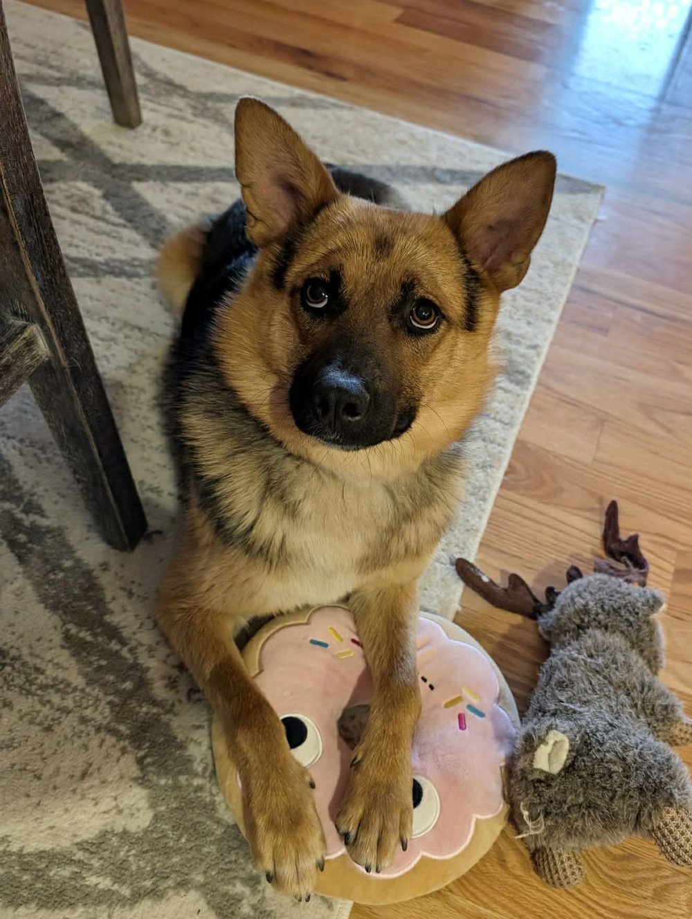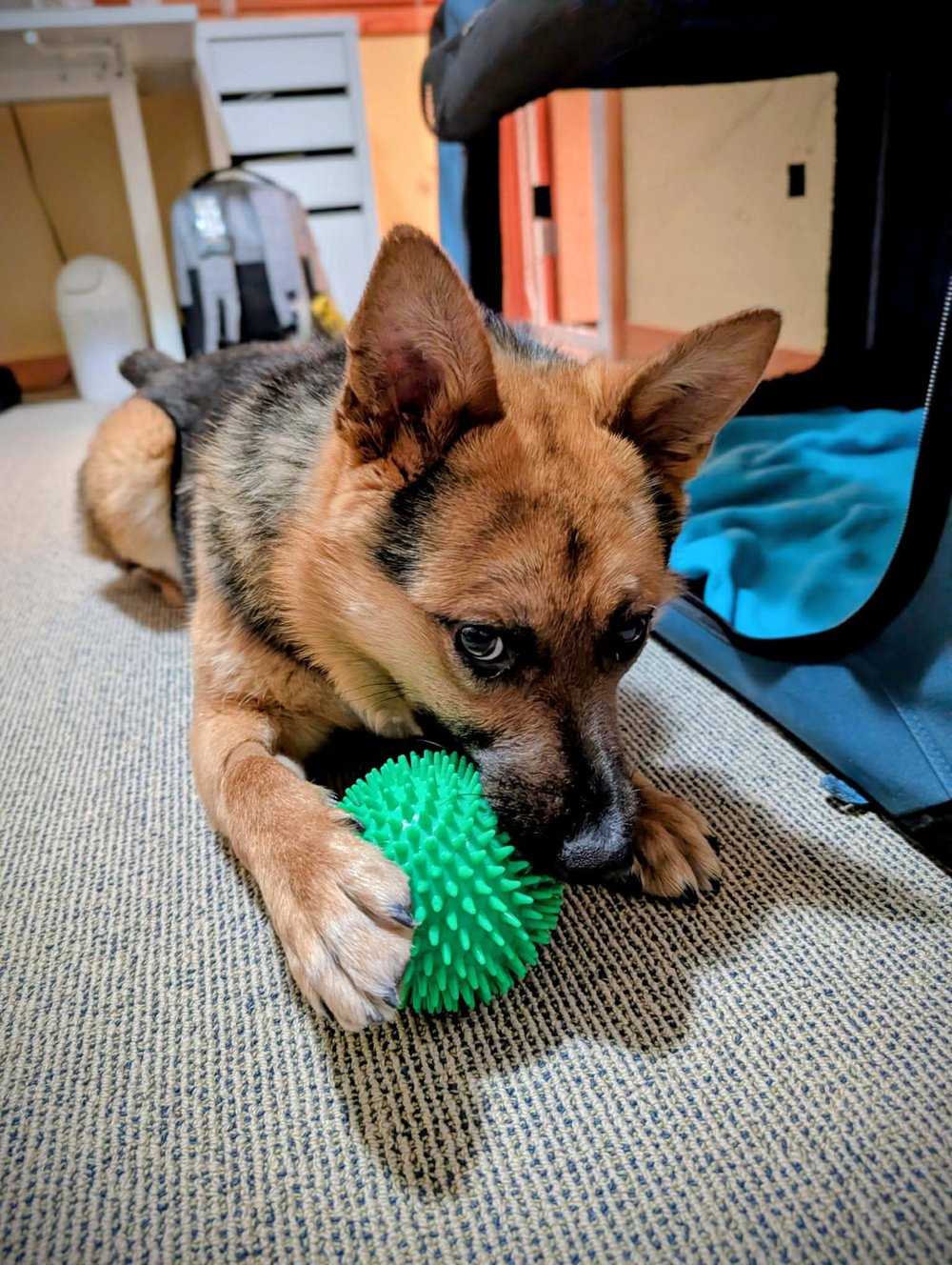 Hey, I'm Percy! A sweet little guy with a whole lot of charm. People say I have striking good looks (like someone took a best-in-show German Shepherd and shrunk him down to a third of the size) and a gentle, discerning nature that makes me pretty irresistible. I arrived semi-feral and am still learning to trust new people and make sense of this big, wide world, but every day I'm getting braver. Once I decide you're a safe and trustworthy friend, I've learned that pets are actually pretty good, and I waste no time climbing into your lap for a cuddle or rolling over for a belly rub. Good thing I'm the perfect lap-dog size!